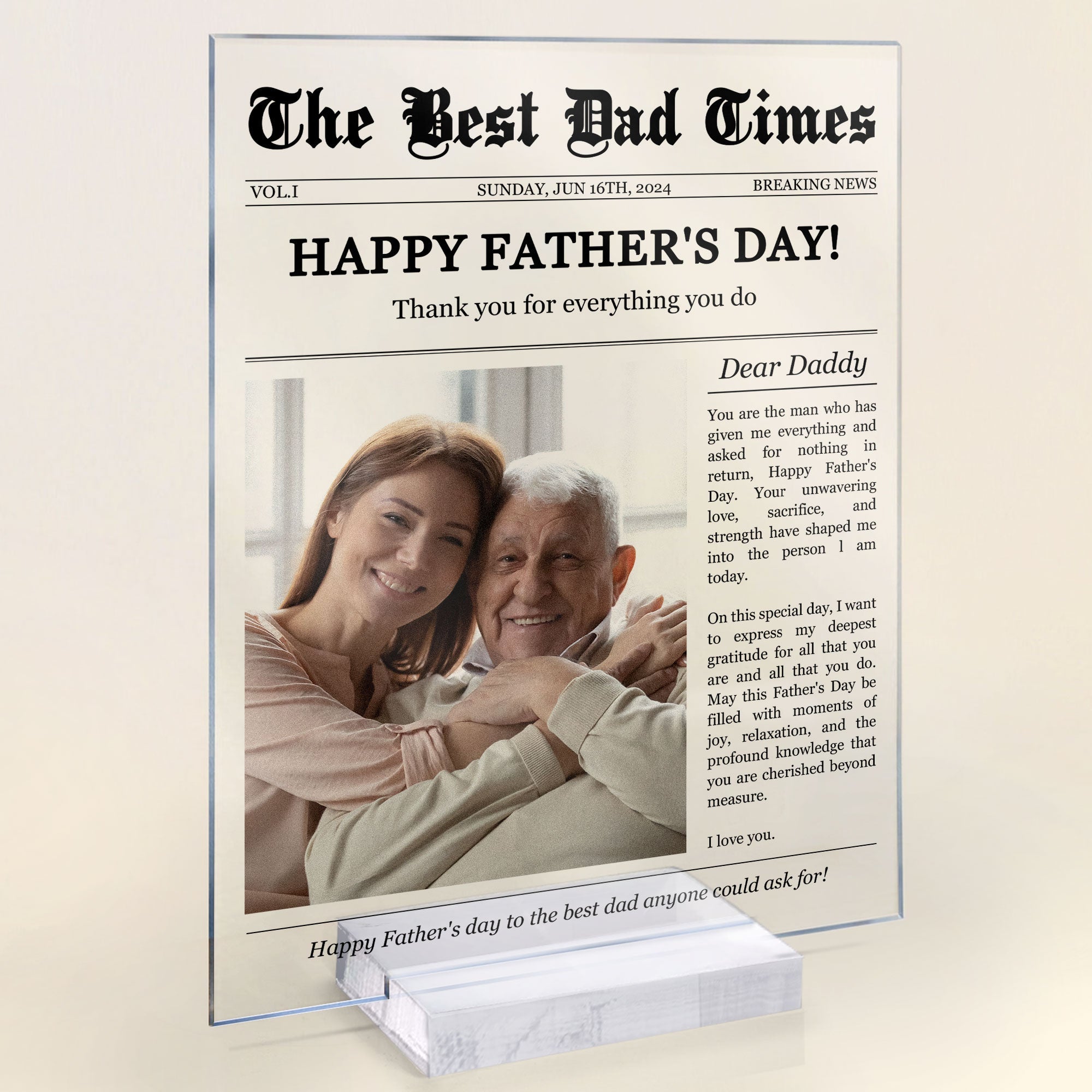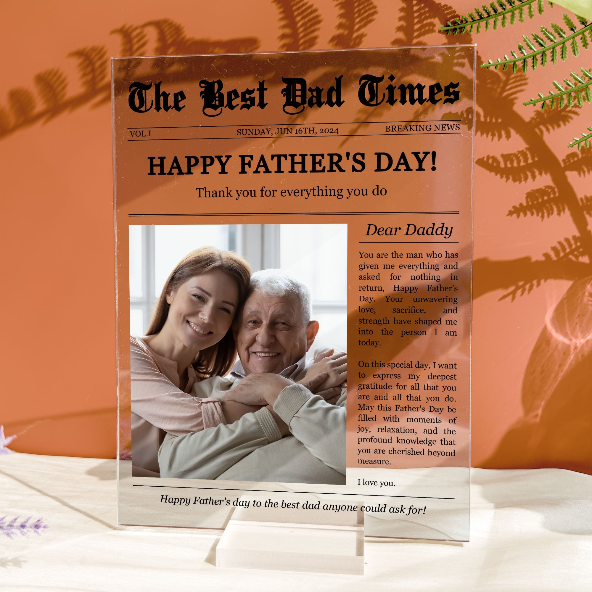 Introducing our Personalized Photo Acrylic Plaque – a unique and elegant gift that captures the essence of cherished memories and celebrates the love of a father. Crafted with precision and personalized with a nostalgic newspaper template, this acrylic plaque is sure to become a treasured keepsake for Dad. Make your gift truly unique by personalizing it with Dad’s favorite photos and memories. Whether it’s a candid snapshot from a family vacation or a posed portrait from a special occasion, our customizable design allows you to create a plaque that captures the essence of Dad’s life and the love of his family. Looking for the perfect gift to show Dad how much he means to you? Our Personalized Photo Acrylic Plaque is a thoughtful and heartfelt choice. Whether it’s a milestone birthday, Father’s Day, or just a day to celebrate him, this personalized gift is sure to touch his heart and bring a smile to his face.